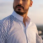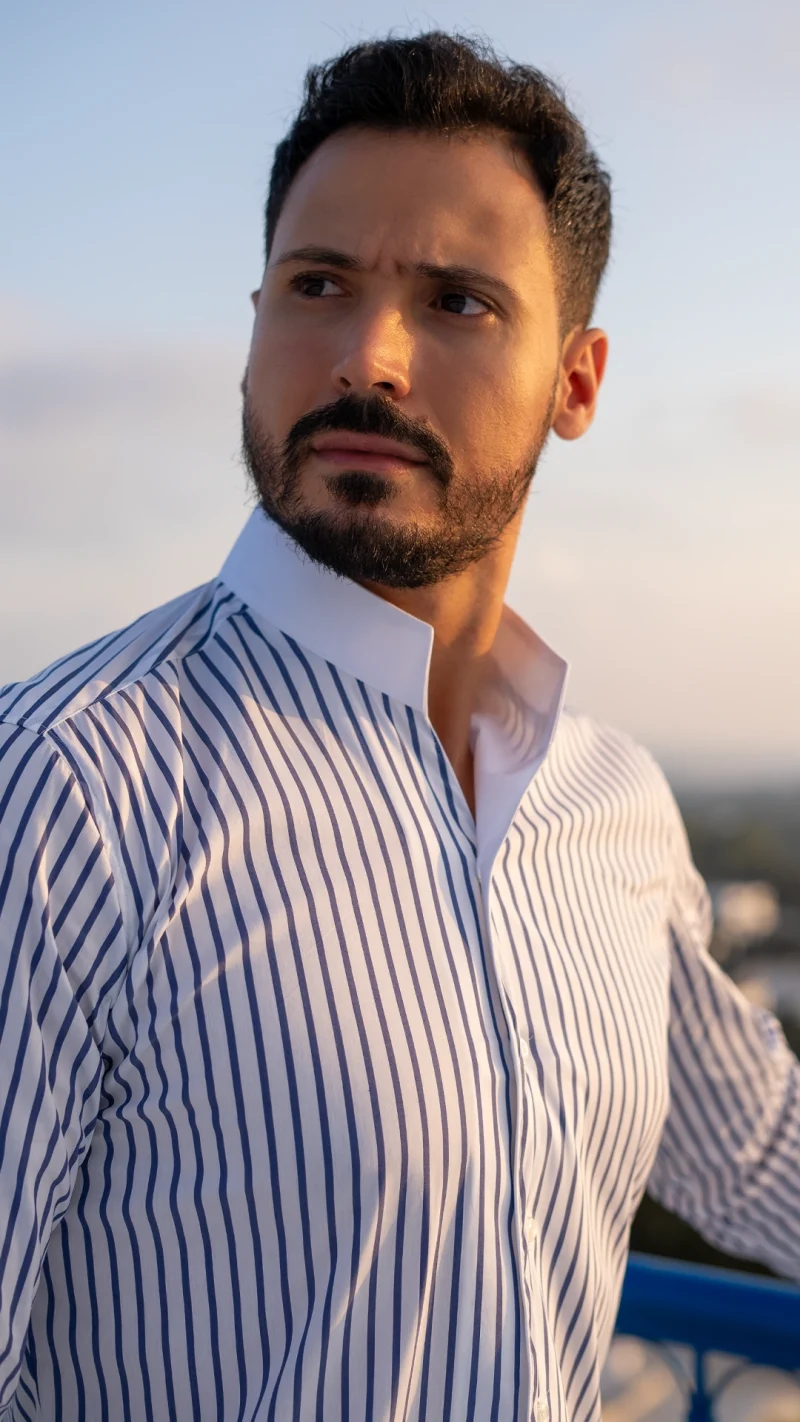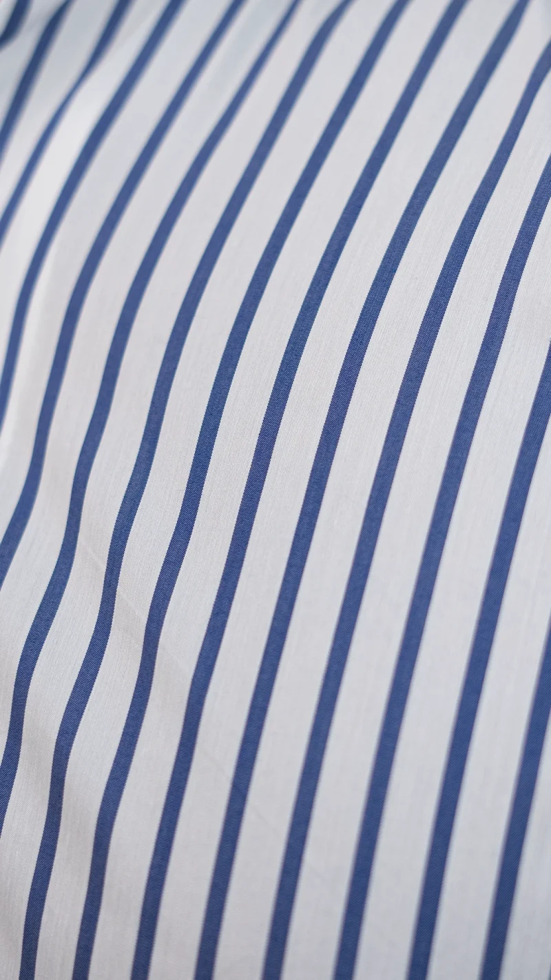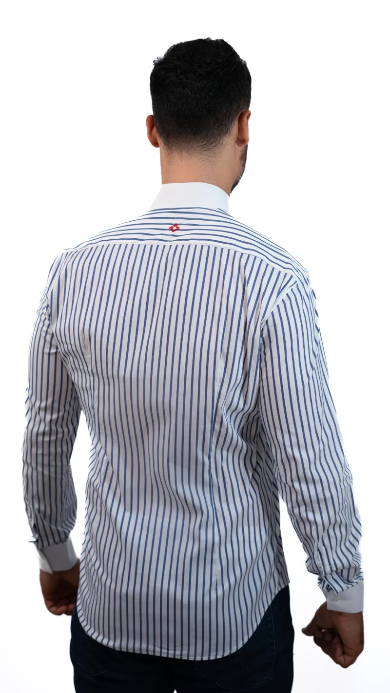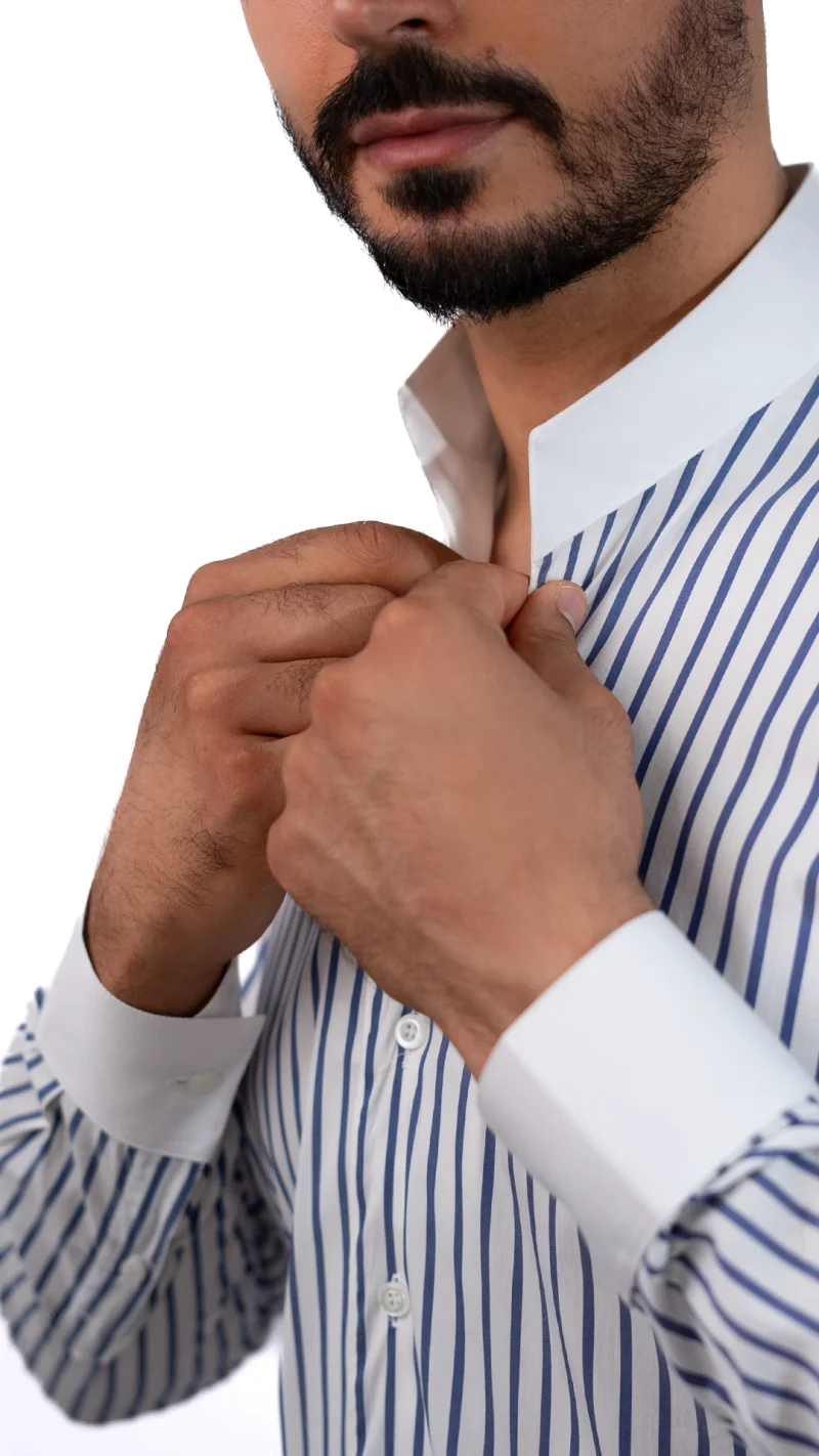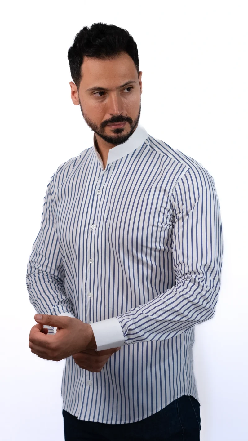 Découvrez notre chemise 100% coton rayures bleues d’une élégance inégalée. Dotée d’un col Philosophe distinctif, ouvert en V, elle allie sophistication et modernité. Parfaite pour vos tenues chic ou simplement associée à un jean pour un look décontracté. L’excellence, pour chaque occasion